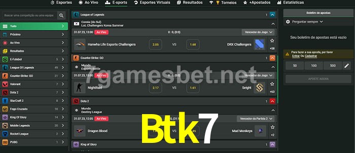 O Btk7 oferece uma grande seleção de opções de apostas em e-sports com probabilidades competitivas